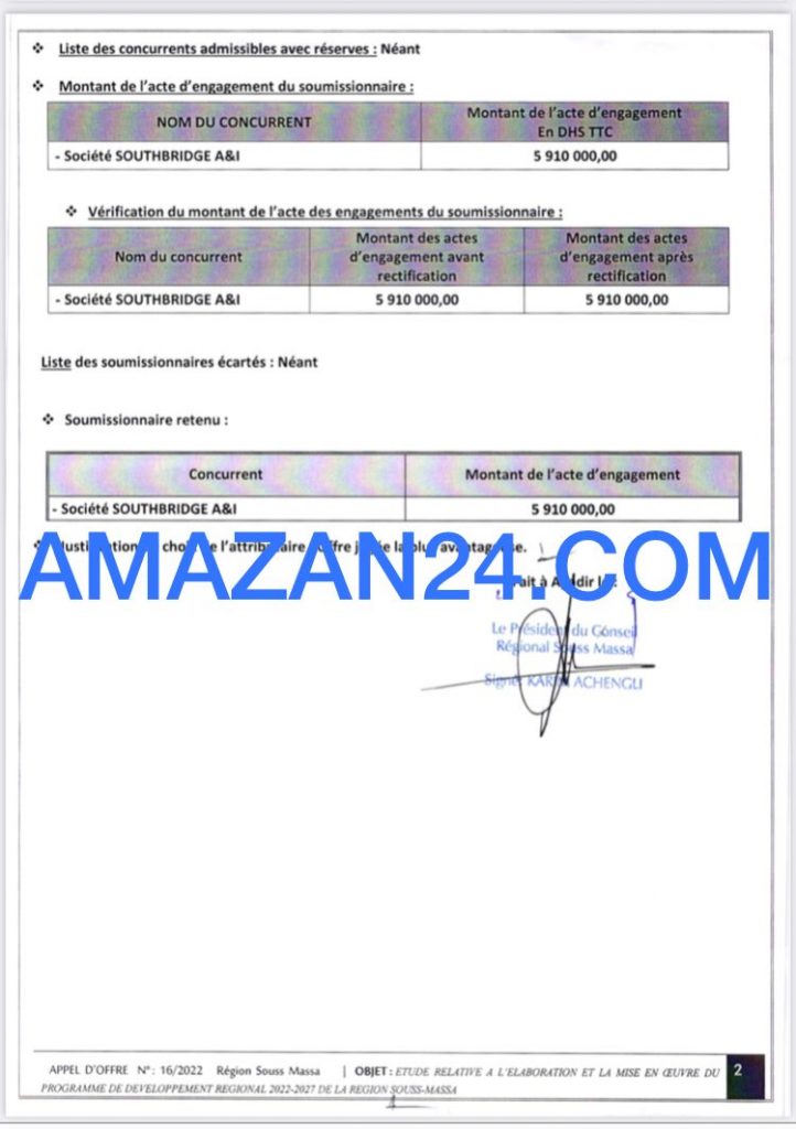 وتنافس مع “ساوث بريدج” على الصفقة كل من شركة MAZARS AUDIT ET CONSEIL بالدار البيضاء، وشركة NOVEC بسلا، وشركة SCIENCES URBAINES ET DEVELOPPEMENT (SUD) بالرباط، وشركة CONEIL INGENIERIE ET DEVELOPEMENT (CID) بالجديدة، وشركة ETIC CONSULT بالدار البيضاء.